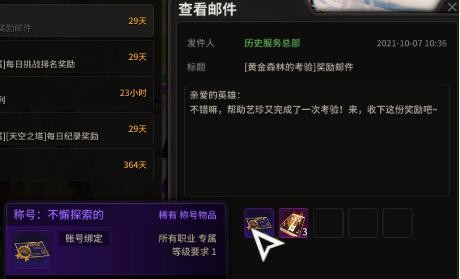 黄金森林的考验第七重回答正确奖励:称号不懈探索的、核心记忆晶卡3