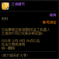 DNF兰迪硬币交给赛丽亚旅馆里的监工机器人兰迪NPC可以兑换多种奖励,100个兑换100个绝望矿石;50个兑换4个增幅器;150个兑换增幅书;100个兑换普通兰迪宠物;500个兑换1级BUFF宠物;此外还有3大团本门票和药剂。