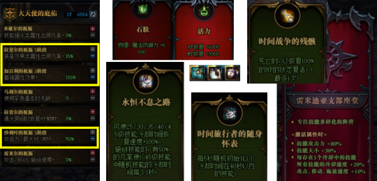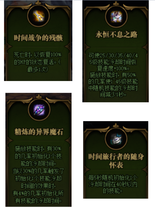必选【时间战争的残骸】以防暴毙、冷却装备【时间旅行者的随身怀表】&【精炼的异界魔石】保证技能的冷却时间恢复速度。若保全技能等级区间在Lv25~55内,必选【永恒不息之路】;