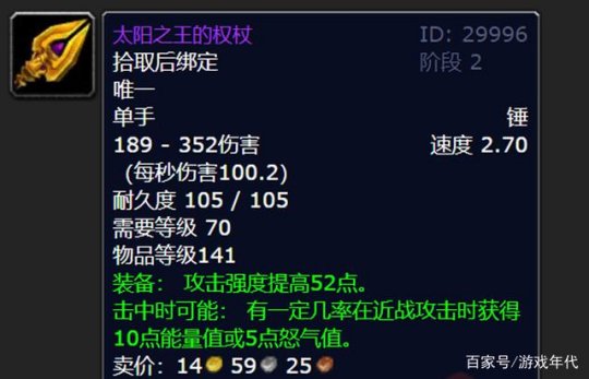 太阳之王权杖本身就有目前最高的武器秒伤和白字输出,52点攻强保证其它单手武器即使加上绿字也赶不上其秒伤。最大的特色自然是它的回能特效,每次攻击有几率为战士盗贼回复5点怒气或能量。对比2个职业的回资源天赋——怒不可遏和战斗潜能,都是需要5点天赋来换一个微弱的回资源效果,战斗潜能更是在盗贼战斗系最深层,1点天赋也仅仅是回3点能量。