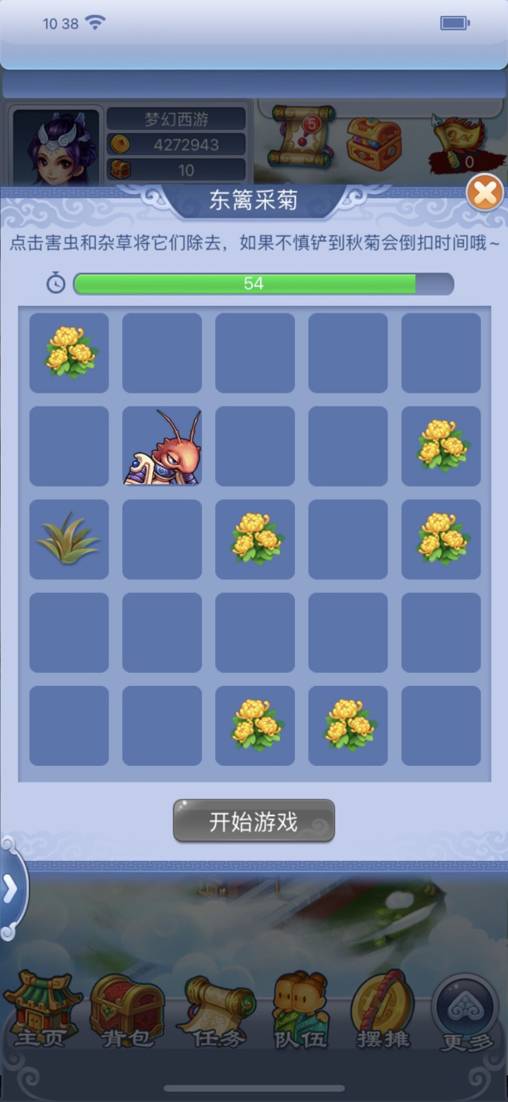 采菊东篱下,悠然见南山。正值金秋,少侠不如和秋菊仙子一起来栽培秋菊吧!点击花圃中的害虫与杂草图案,将它们一一除尽,待金菊长满花圃即为成功,仙子还有丰厚的谢礼相赠哦!