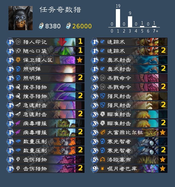 时隔一年之久,猎人终于再次成为了狂野的巫妖王。任务奇数猎就是目前狂野环境里最强的卡组,前期拥有不错的解场能力,在做完任务后就可以攒一套伤害把对面点死;对阵偶数术时直接开始挂病毒增援并射箭抢血,进入斩杀线后一套带走。任务奇数猎在面对大多数主流卡组时都能占均势到优势。