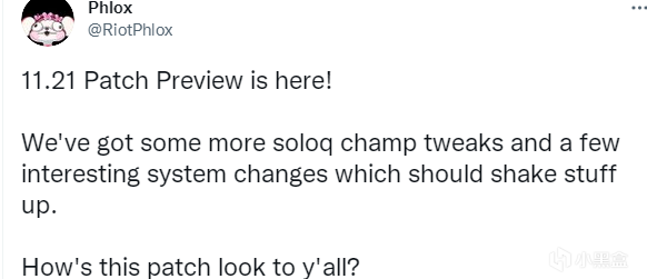翻译如下:11.21 补丁预览来了! 我们有一些更多的单线英雄调整和一些系统性改编,这些变化应该会对环境所改变。 大家觉得这个补丁怎么样呢?