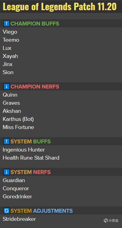 英雄加强:佛耶戈、提莫、拉克丝、霞、金克丝、塞恩。