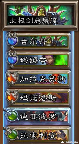 这是炉石职业选手太极剑组建的恶魔佣兵队伍。古尔丹是这套比较核心的一个点,他的生命虹吸可以为友方恶魔恢复大量生命值,因此高攻击慢速的恶魔们可以续航很久。