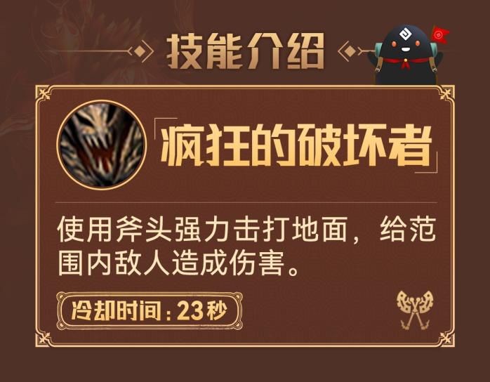 1.【疯狂的破坏者】:使用双斧强力地砸击地面,对范围内的敌人造成大量伤害,同时首次成功击中对敌方可造成眩晕效果,最后的攻击会造成击倒效果,按住释放还能打出追加攻击哦!这个技能集输出与控制为一体,属于输出控制技能。