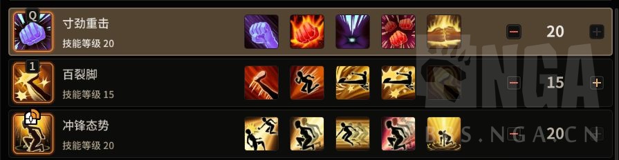攻击力加成成长收益较差。点满5阶段(20技能点)提升百分之10的近战攻击力(不如我2阶段燃虎,滑稽)和一些附加效果-不如技能范围,极少的减CD什么的。并且不知道这个近战攻击所指的有限范围是多少,毕竟铁拳的寸拳和旋风腿是可以用边缘刮的。所以这儿,目前来版本技能点紧缺的情况下,建议不点。吃他自带1级百分之5的加成即可。