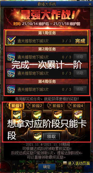 不行。本次最强大作战活动奖励分为周任务与累计阶段两个部分,周任务完成后即可领取最强大作战礼盒并为累计奖励提升一个阶段。在第四周刷新后,即可根据阶段数领取累计奖励作为最终奖励。