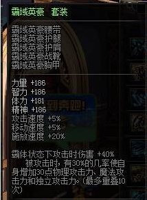 霸域英豪套装可以说是85史诗套装中比较万金油的存在,能够赋予角色霸体效果,鞋子还能有一个持续性的加速(比球手更稳定一些),还有受攻击增加属性的效果,当时追求秒杀的玩家基本都会在战斗前通过燃烧瓶一通烧自己来猴戏。