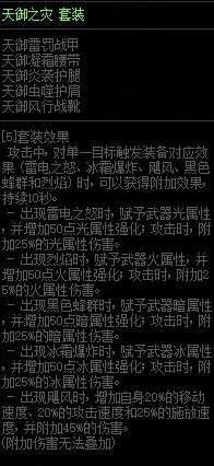 天御之灾套装自登场就因为其拥有不错的属性和各自特效而被玩家青睐,一度在85史诗套装中最受各路玩家喜爱。后期也仍旧因为其特效经常被用于连击套装来破防卢克。