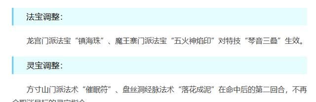 首先是关于龙宫和魔王门派法宝的改动对琴音三叠生效。然后催眠符和落花成泥在命中后的第二回合不再取消目标的灵宝指令。