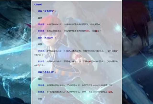 大唐官府三个流派均是静脉技能数值上的微调,改动比不大,上车难的问题依然没有改变。