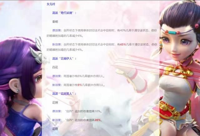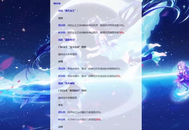 神木林流派“灵木神侍,门派法术“疾风秋叶”调整:基础法术伤害提高。秀木新效果:风灵转化为木精的几率提高25%。凉秋新效果:疾风秋叶额外作用1个单位且伤害提高3%,但需消耗2点木精。秒6神木林喜获加强!接下来的几个门派我就简单叙述一下,详情可查询官网。剩下的几个门派调整大都集中在新出的第三个流派之中,除了花果山降低门派技能伤害倍率外,其他门派的改动对于PVE的影响并不大,这次的调整只要还是针对PVP以及数值上的一些微调。