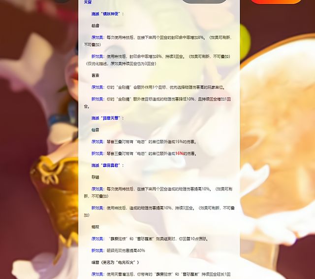天宫镇妖神使静脉技能套索效果改为你的“金刚镯”额外使目标造成的物理伤害降低10%,且持续回合增加1回合。魔天宫静脉技能仙音提高1%的数值。流派霹雳真君静脉技能存雄改为使用特技后,造成的物理伤害提高10%,持续3回合。(效果可刷新,不可叠加),静脉技能感叹新效果为破碎无双伤害提高40%。嗔雷(更名为“电光石火”)【替换法术:天雷灌注】使用后同时获得“霹雳弦惊”和“雷怒霆激”状态。【消耗】140点魔法【冷却】战斗开始时具有9回合冷却,自身死亡后冷却回合重置为9回合。