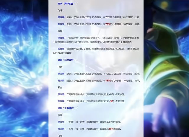 龙宫海中蛟虬静脉技能斩浪重做新效果:如果敌方恰好有7个单位,则龙卷雨击暴击率提高7%(21%)。(括号里为与NPC战斗时的效果),其他改动均是数值调整。不过高级龙宫真有可能做到秒7爆7了。