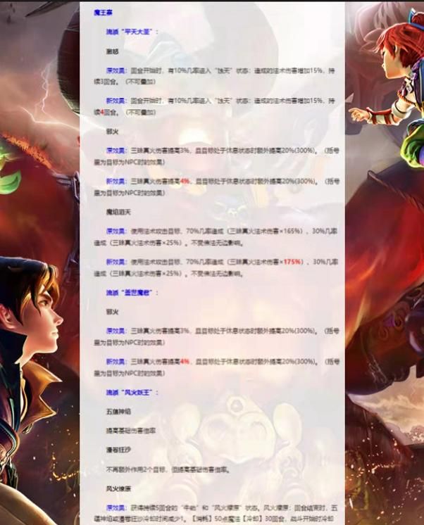 魔王总体而言伤害略微提高,主要改动在流派风火妖王中,五蕴神焰提高基础伤害倍率,漫卷狂沙不再额外作用2个目标,但提高基础伤害倍率。