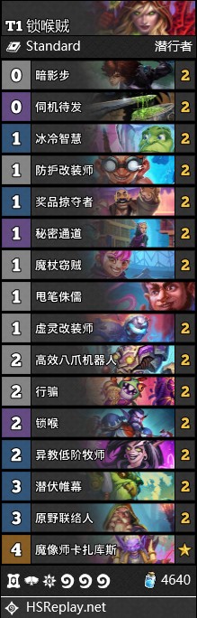 补丁前盗贼已经是环境顶端傲视群雄了,没想到万千玩家翘首以盼的补丁把其它职业削了一遍却把最强之一的盗贼给遗漏了。显而易见的后果是补丁后盗贼成为了无论比赛还是天梯上的首选。锁喉贼本身的定位是一套具有很高斩杀otk能力的节奏卡组,一些玩家只看见了它能打otk的能力却忽略了它很强的打节奏能力是需要深化理解的,如果类比之前版本的红龙贼,可能就好理解了,大概只是换了一种更简单的otk斩杀方式,本质上还是那套节奏卡组,八爪机器人和联络人才是精髓。锁喉贼正是因为具备塞布、八爪机器人、奖品掠夺者这些抢节奏能力极强的牌,使得它能在环境里显得万金油,在对阵中速卡组时不落下风,从而替代了绝对自闭的加基森鲨鱼套,又因为具备很高的斩杀otk能力且当前环境里几乎没有能反制的办法,压制的中速或者控制卡组出场率上不去,本身上限高、强度高、对绝大多数卡组优势且个别劣势对局劣势较小、操作空间大、对熟练度要求高,因此成为了一套适合上分且可玩性很高的卡组。