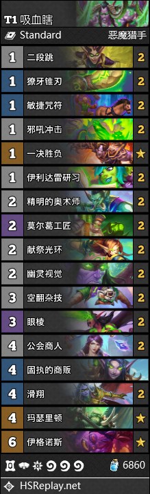 任务吸血瞎在蛮兵削弱之后少了一个赢点,可以说是元气大伤。但在快攻和锁喉贼居多的环境下任务吸血瞎仍然保持着很高的竞争力,特别是由于能counter锁喉贼,所以在黄金赛的赛场上也出场率颇高,最后的决赛决胜局也是一场精彩的吸血瞎内战。吸血瞎的构筑经过演化后舍弃了复制恶魔,携带四交易(一般为两434法强,一334蛇和一443亡语),而玛瑟里顿也因为能够卡术士的大怪和锁喉贼的格子得以加入构筑,(玛瑟里顿改成瞎子职业卡算了)玛瑟里顿的加入让吸血瞎卡组能够应对更多情况--尤其是面对中速节奏卡组时,单卡的加入能让这类对局提高不少胜率。