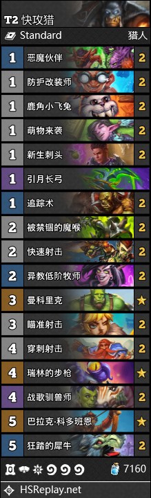 补丁后猎人最大两个敌人任务萨和暗牧遭到重创近乎隐藏,任务术和任务吸血瞎也受到不小的影响,于是猎人们又开始在角落里狂喜。前两天刚刚过去的黄金赛中猎人也有不错的表现,本期我们推荐的猎人构筑来自于亚军月神帝(Melody)的标准三十张,魔喉在猎人失去科卡尔之后稳定占住了两张二费卡位。猎人在补丁后的新环境中劣势对局很少,只有快攻德是猎人比较难以应付的对局,所以很推荐大家用来上分使用。