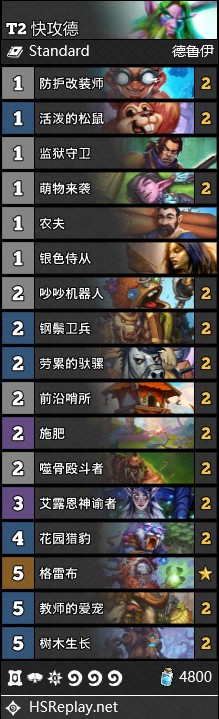 快攻德的强度得到了肯定,在各大赛事和天梯中表现都很不错。AlanC86使用快攻德拿到了GM周冠军,此生不肯解连环使用这套卡组拿到了成都黄金赛八强。思路主要还是钢鬃卫兵和艾鲁恩神谕者的配合展开,对阵otk和偏慢速卡组时前沿哨所优先级较高。花园猎豹可以根据情况换成卡扎库斯,也可以补充蠕动的恐魔增加前期的场面压力。