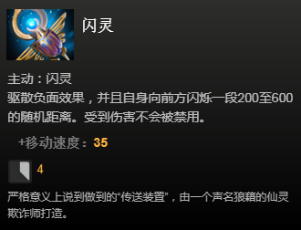 闪灵的最初版本是随机方向闪烁200-600的距离,当时可以说是最弱的额四级装备没有之一。因为你不知道你使用它逃跑的时候会不会反而进入了敌方英雄的“怀抱”。但此后的版本中,闪灵的主动效果改为了固定向身前的方向闪烁,这也让闪灵一跃成为了四级装备中最受喜欢的道具。和跳刀相比,闪灵虽然闪烁距离较短但完全是白嫖的不用花一分钱,另外使用闪灵的时候还会驱散身上的负面效果。在职业比赛中,优势的一方大哥推高时经常就会佩戴这一道具以免被对手各种技能骚扰,同时还保证了一定的先手威慑力,由于五级装备在大部分对局中并不会出现,所以闪灵确实是目前最强的中立装备。