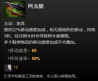 这件道具在中立装备刚刚更新时是职业比赛和普通对局中使用率差距最大的装备。在低分段对局中,这件装备只提供多余的移速以及12秒一次的穿越地形的能力并不如其他正面加成战力的装备受人喜欢。但随着职业选手的开发,普通玩家也开始重视这件装备。利用网虫腿的主动效果在刷野的时候能够提供节约不少的时间,而网虫腿在逃跑的时候也有让人意想不到的效果。而职业比赛中,许多诸如骷髅王、斯温等相对笨重的英雄,选手们也非常喜欢佩戴这件装备。