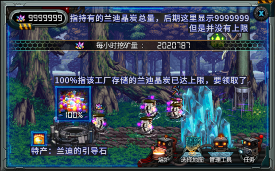 选择地图:一共10张地图,需要把当前地图的工厂升到满级才能解锁下一个地图,每解锁一个地图就会多一个地图采矿,最后可以10个地图一起采矿,所以我们要优先解锁地图