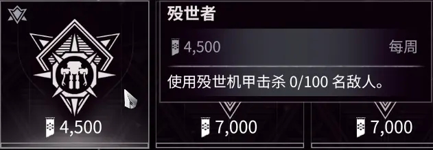 殁世机甲击杀100名敌人,有自己机甲的直接去平原打一圈,没机甲的可以在火卫二魔胎之境FASS时段去找野生的殁世机甲,然后击杀敌人来完成。