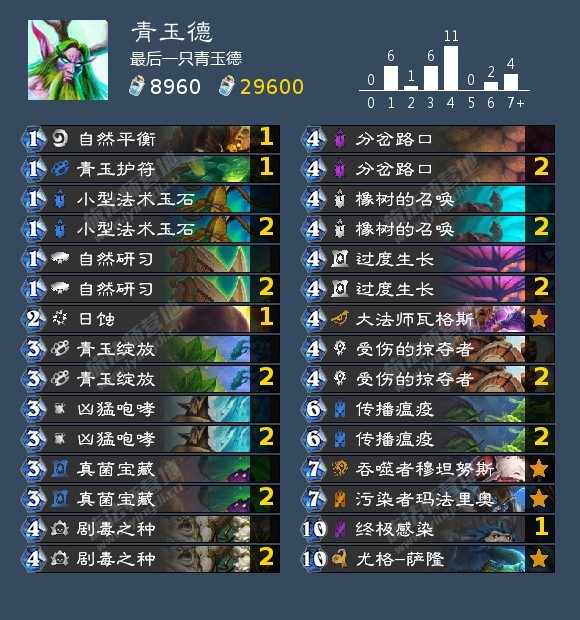 虽然青玉绽放的模型放在今天已经完全不够看了,不过好在有1费研习2费绽放4费橡树的combo在,有费用才有更大的操作空间。正常来说吃手手是来不及反制现在的otk的,不过我们是个德鲁伊可以跳费,这就给了吃掉鬼灵贼刀油的可能,奇数猎海盗战也很少会去防德鲁伊的吃手手,当年环境下配合吃手手携带两张过度生长是很有必要的。