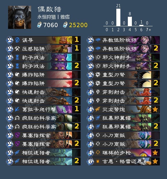 接着是偶数猎的几个小细节,第一是在手上有奥秘的情况下,要学会控奥秘,比如手上有豹子,场面急需爆炸来处理,这个时候可以选择挂豹子,然后科学家送掉或者相位射箭,这样能提高爆炸挂头的概率,第二是小刀的使用,小刀多数情况是进行一个斩杀来使用,除非你的手牌卡手可以选择在45费时候下去战场,因为小刀是一个双刃剑,在不能斩杀的时候下去,往往是提高给对手斩杀的机会。最后一点是要学会计算伤害,时时刻刻都要算清场面于手牌的合计斩杀量,如果有时候手牌的直伤手牌刚好或者不足以斩杀对面,这种情况就不要想着处理场面,因为没资格,只能赌下一手直伤或者我们没有进对手的斩杀线。