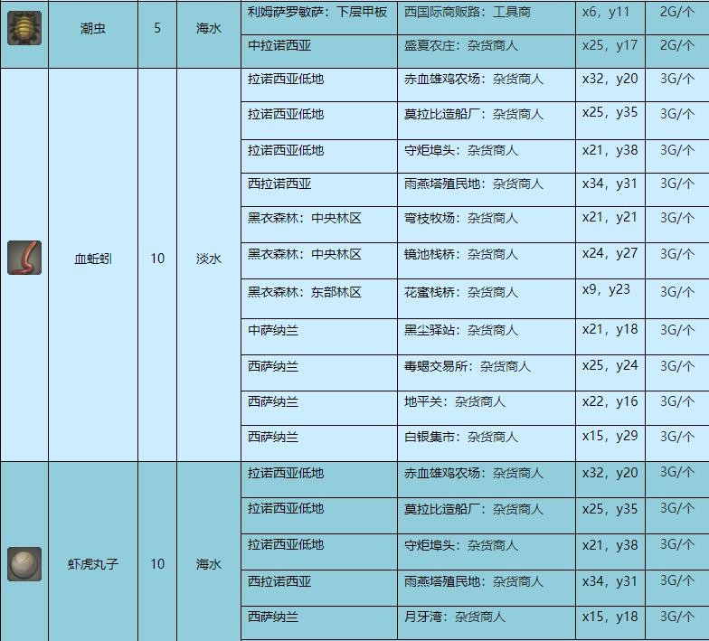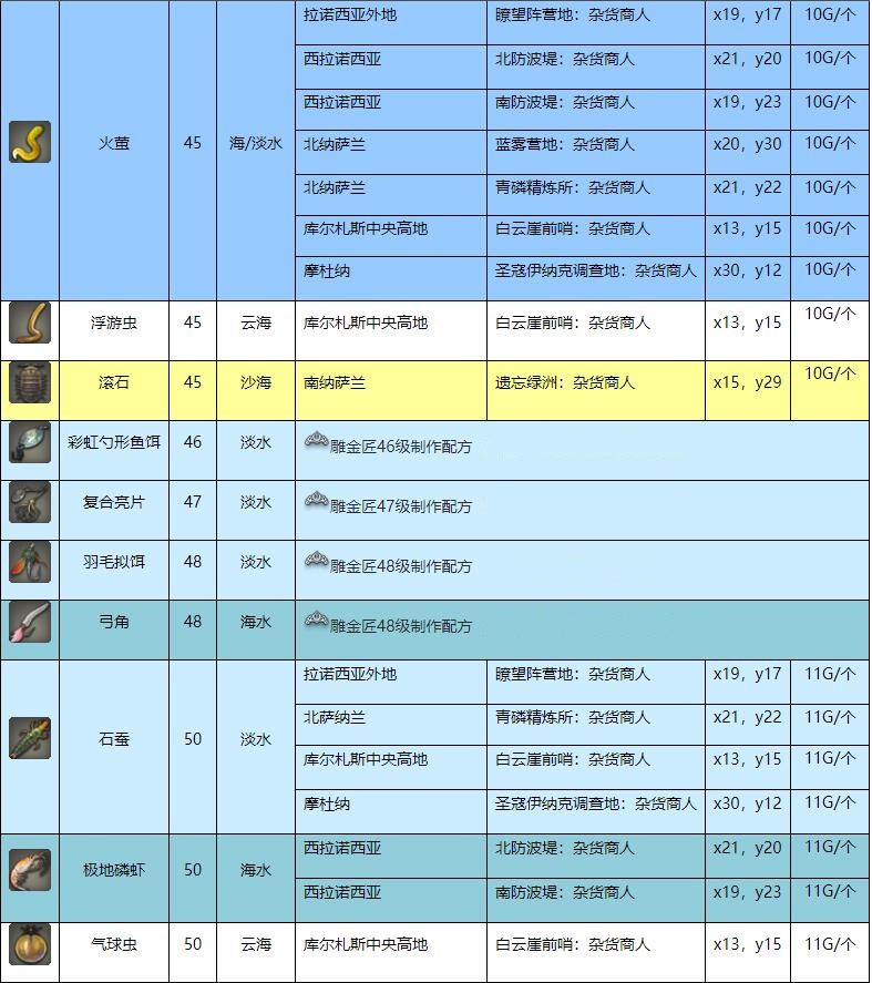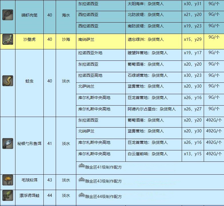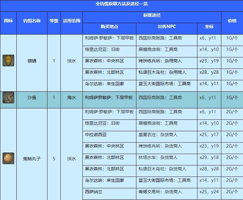 每种不同的鱼饵可以在不同地区里面的杂货商人处购买获得。