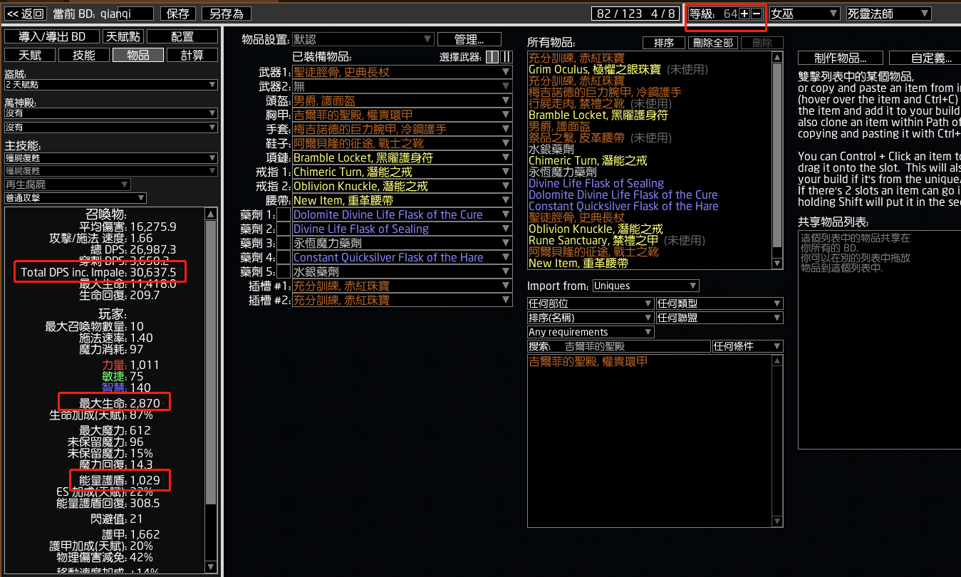 64级3900多血盾,10个僵尸,10个骷髅,一个腐化魔像,3灵体,一群瓦尔骷髅,dps应该有40w左右,应该有进异界的资格了,注意这个时候我们有狂热誓言,生命秒回会作用到护盾上,要带好血药