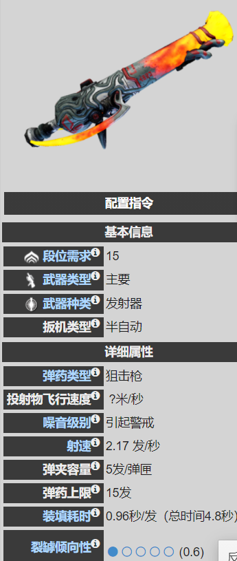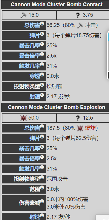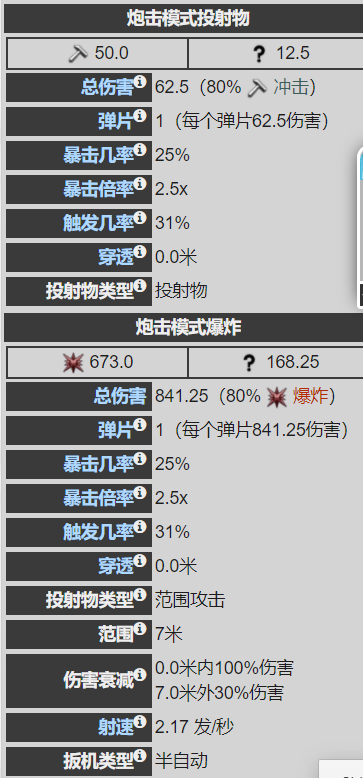 炮击模式的基伤是来个了大提升,终于是个合格的炸比了。子母弹反正一直是白送的,基本也轮不到它打伤害。弹幕模式也是相当的顶,暴率应该是喷子第一了,尽管这货是步枪配卡。不过步枪配卡也有优势了,一方面是步枪暴率卡更高,另一方面步枪重口数值也高得多。