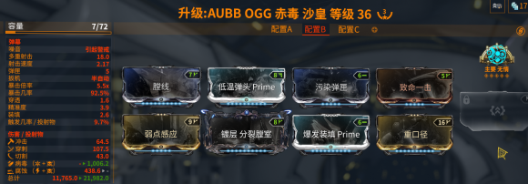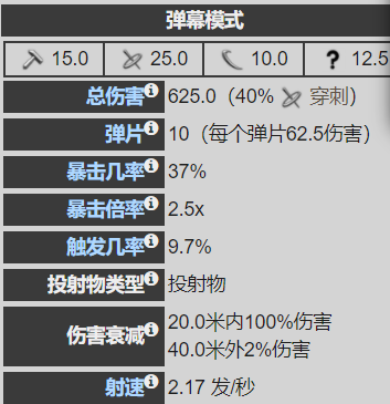 弹幕玩法这边其实就是换成病毒了,为什么换也很好理解,有镀层多重保证触发,基础弹片数高,本身触发几率也不是太低。想进一步追求手感还可以下了毒卡位,弹幕的伤害还是不俗的,毕竟喷子第一暴率在那,还有元素加成加持的极高基伤。高暴击配合猎人切的玩法也是可行的,这里就不再单独拿出来讲了。