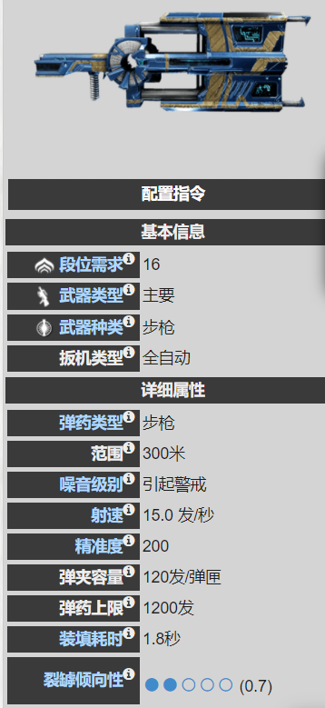 看面板还是比较平庸的,特别是这1.8暴伤非常刺眼。有心的玩家或许会发现,这把枪跟原版有一些“变化”,可以看到扳机类型变为了“全自动”,而射线武器的扳机应该是连射,这说明了什么,说明它已经不是射线武器了。同时,这把枪的射速也是15,而不是射线武器通常的8/12。