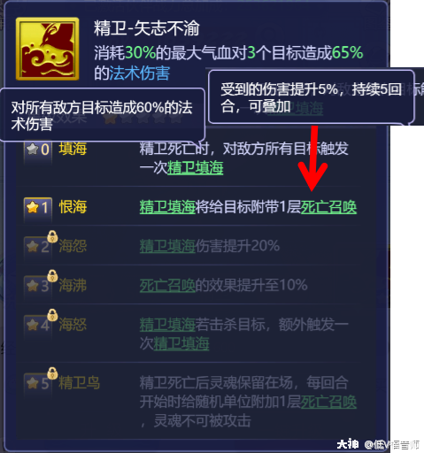 1X:精卫填海将给目标附带1层死亡召唤(易伤5%)