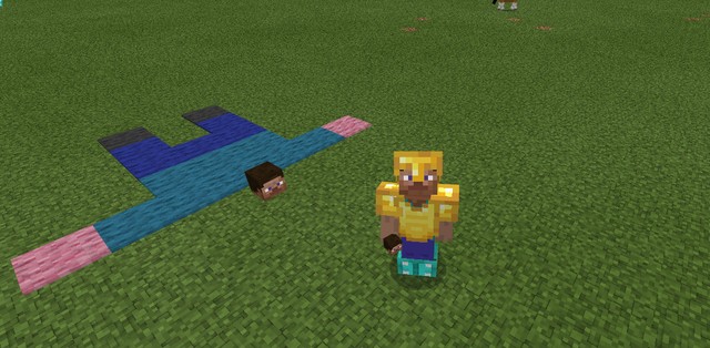 咱们先准备好灰色、蓝色、青色和粉红色地毯,然后从脚开始第一层的两端分别放一个灰色地毯,第二层两端分别放蓝色地毯,第三层直接放三个蓝色的,第四层放三个青色的,第五层放五个青色的,两端再分别多加一个粉色的,最前面再摆放一个史蒂夫的头模,这样,一个“史蒂夫饼”就完成了~