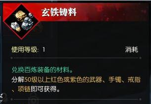 2.玄铁铸料:分解50级以上红色或者紫色武器,手镯,戒指,项链获得