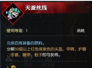 3.天蚕丝线:分解50级以上红色或者紫色头,衣服,护腕,手套,腰带,鞋子获得