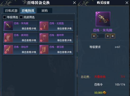 1.兑换百炼装备需要三种东西:玄铁铸料/天蚕丝线+百炼令+5w铜币(每个职业要求是一样的)