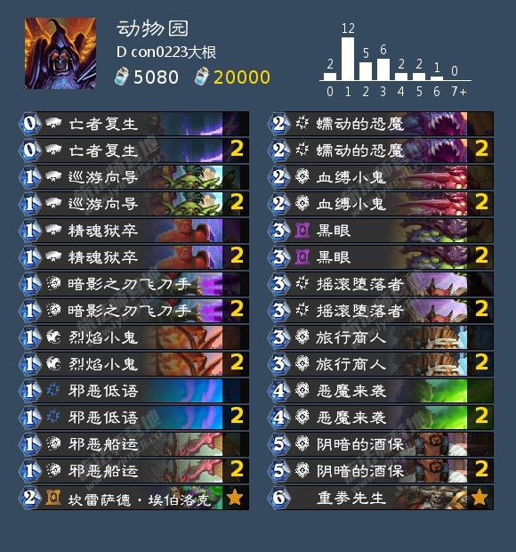 一套比较纯粹的恶魔园,卡组的核心是围绕着阴暗的酒保展开的,新卡邪恶船运只需要交易一次打出就能达到卡组的预期效果,不论是配合旅行商人做一个大哥站场还是配合阴暗的酒保铺一波大的场面都是很不错的选择。卡组的中前期框架还是使用了黑眼自残体系来做到快速铺开场面,新卡暗影之刃飞刀手很契合前期这个思路,掉血铺场的同时还能解掉对手一个怪。重拳先生有点像之前动物园里火车王大哥的角色,提供最后的斩杀,我觉得对于动物园来说这一点斩杀是很重要的,因为动物园前期抢血很快,后期需要有一个斩杀手段终结比赛(暗影之刃飞刀手也是海盗)