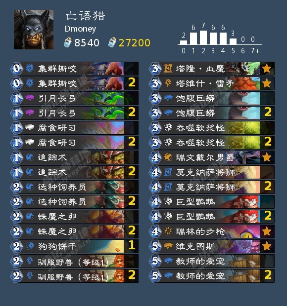 如果没有新卡巨型鹦鹉谁会玩亡语猎呢?之前为狮酱专门设计的莫克纳萨将狮那么超模的效果都带不动亡语猎,(现在这个鹦鹉还不带突袭,感觉还不如之前的将狮。)于是Dmoney直接将狮+鹦鹉,比较好的情况是三费出个饱腹巨蟒,四费将狮,五费出个鹦鹉?(说实话我也没感觉很强)亡语猎的操作很简单,拍亡语怪,铺场,打脸,对手能同时处理掉你的场面和你的亡语就下一把,Dmoney还带了两个选种饲养员来检索巨型鹦鹉和将狮。驯服野兽和雷矛的combo我之前写日报提到过,二阶段的被驯服的蝎子是四费,五费的这个combo可以再拉出来一个三费野兽,问题来了,为什么不带终极随从呢。。?也可能是Dmoney只想打场面,稳定拉饱腹巨蟒(而且二费确实没有好野兽),其他配合都是不现实的,对手不会给你这个机会。(说实话我真感觉这个雷矛带的有点尬,难道猎人还能站一个教师的爱宠对手不解你吗?不解你你拉出来没有特效的将狮鹦鹉不是血亏吗?说明亡语猎这个思路卡不够齐全,好多体系是强行带上凑数的)
