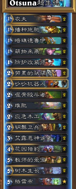 相比暴风城的超生德增加了应急木工以及暗礁德鲁伊,这两张卡都是显而易见的超模卡,应急木工可以定向抽播种施肥可以随时给随从+1攻还可以召唤一个2-2的树人,暗礁德鲁伊可以突袭解场也可以变形成1/3进行场面交换,主要还是应用于突袭解场,其他的框架跟暴风城的超生德没有区别,因此这里不过多展开。