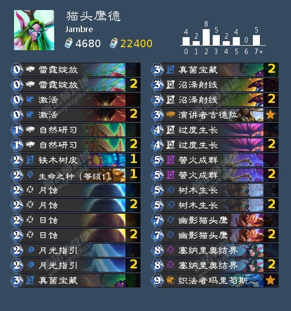 这个版本这套牌最大的加强是月光指引,不得不说这张单卡太契合这个思路。凭空可以给这套猫头鹰德增加很多厚度,无论是抽0费的猫头鹰还是中期的树木生长,又或者后期多抽一个塞纳里奥结界,都是对卡组整体质量巨大的提升。因为这个版本aoe比较少,满编了萤火成群+树木生长的combo,换掉了当时的夜行虎体系,一些玩法和思路可以点开上面那个链接看一下之前的那套,我觉得大同小异。