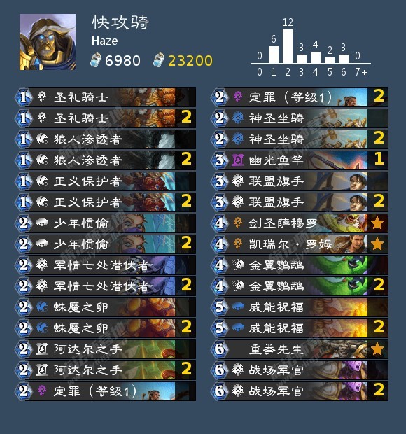 这套快攻骑的思路还是有点像定罪和站场军官削弱前的版本,比较依赖生物站场后贴buff然后用站场军官的风怒斩杀对手。前期选择拉满了潜行随从(足足带了6张),方便给后续的buff牌提供载体。新卡金翼鹦鹉对这个思路的加强比较大,不管是前期配合阿达尔之手的站场+过牌还是中期配合威能祝福凭空造一个大怪,都能给对手非常大的场面压力,是中期非常扎实的生物。这套骑士目前还是有一定强度的,新卡重拳先生也能解决骑士前期压住血量后期缺一点伤害无法斩杀的问题。