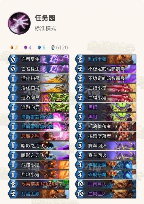 任务园的构筑不同在加入了两张暗影之刃飞刀手和碎舰恶魔,暗影之刃飞刀手本身1费就是非常灵活的解场手段,搭配这个任务体系本身掉血还可以用于解场,一举两得。碎舰恶魔亏了一点身材但对掉血体系帮助很大,可以去检索为数不多的法术牌并加速做任务。