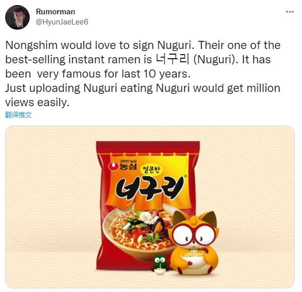 近日有外媒爆料称NS正以打造一支打进世界赛的队伍为目标接触Nuguri,而今日外媒记者HyunJaeLee在自己社交媒体称:农心很想签下Nuguri。他们最畅销的方便面之一是너구리 (小浣熊拉面)。在过去十年里,它非常有名(Nuguri在韩语中有浣熊的意思)