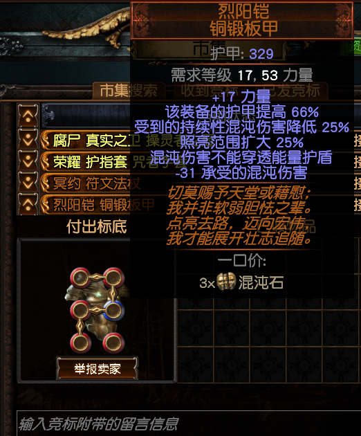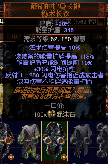 4、衣服:薛朗的护身长袍,俗称大CI,提供了高护盾,混沌伤害不能穿透能量护盾,建议去黄金港搬砖拿下。
