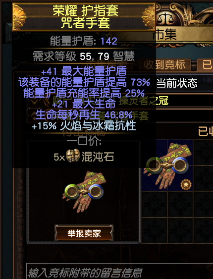 5、手套:高护盾的的稀有手套,最好空一后缀,可以工艺抗性或者属性,后缀自带抗性或者属性更好
