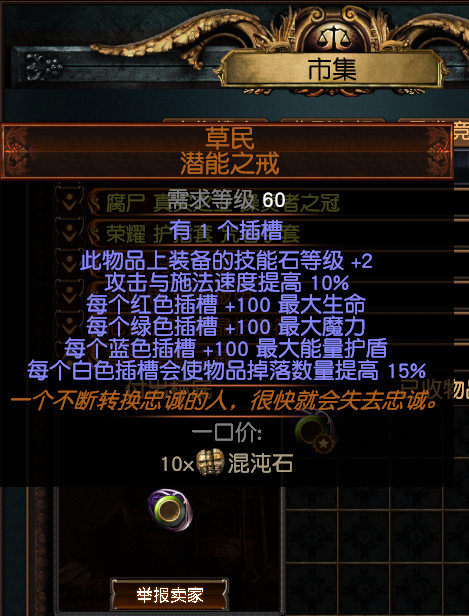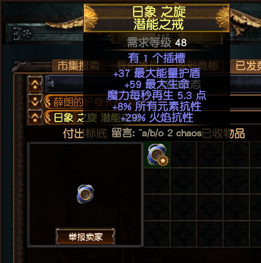 戒指2:潜能之戒,选择护盾+抗性的,最好空一后缀,可以工艺抗性或者属性